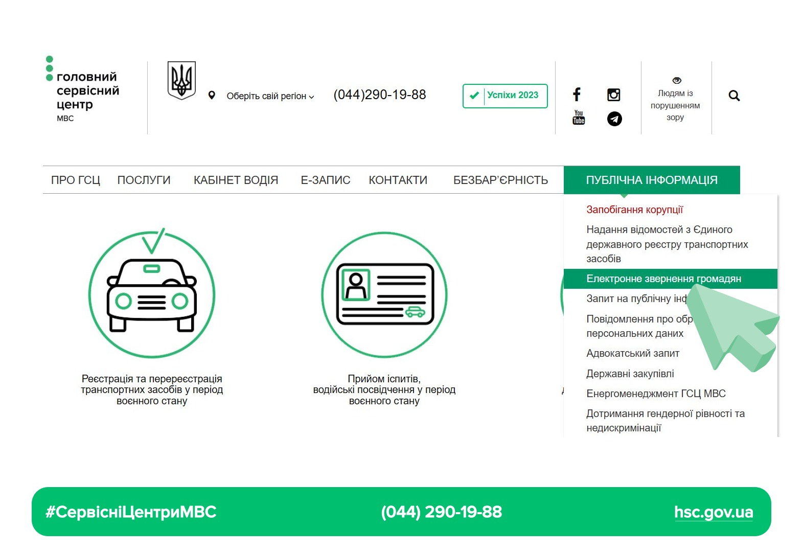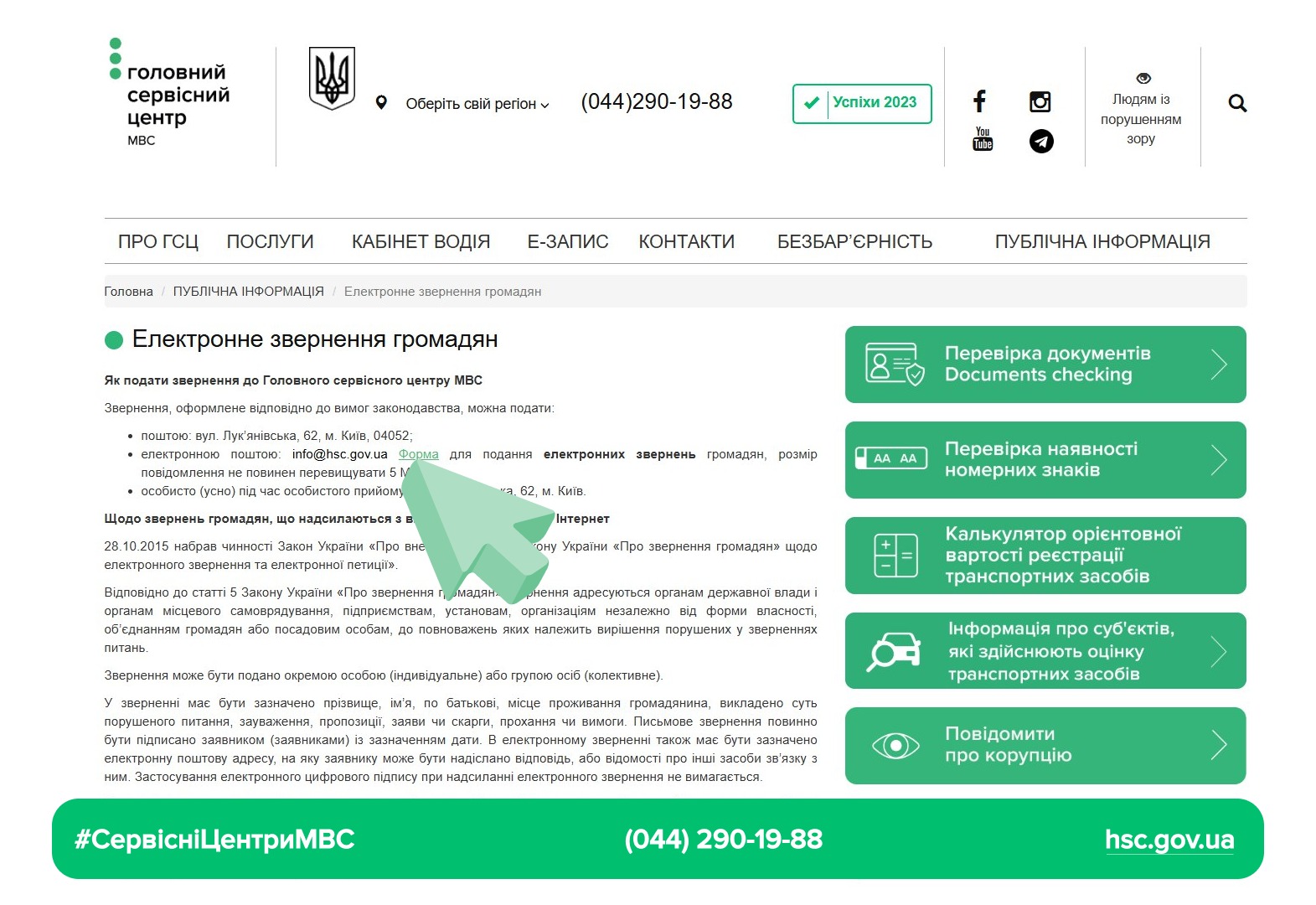 - електронною поштою: info@hsc.gov.ua Форма для подання електронних звернень громадян, розмір повідомлення не повинен перевищувати 5 Mb;