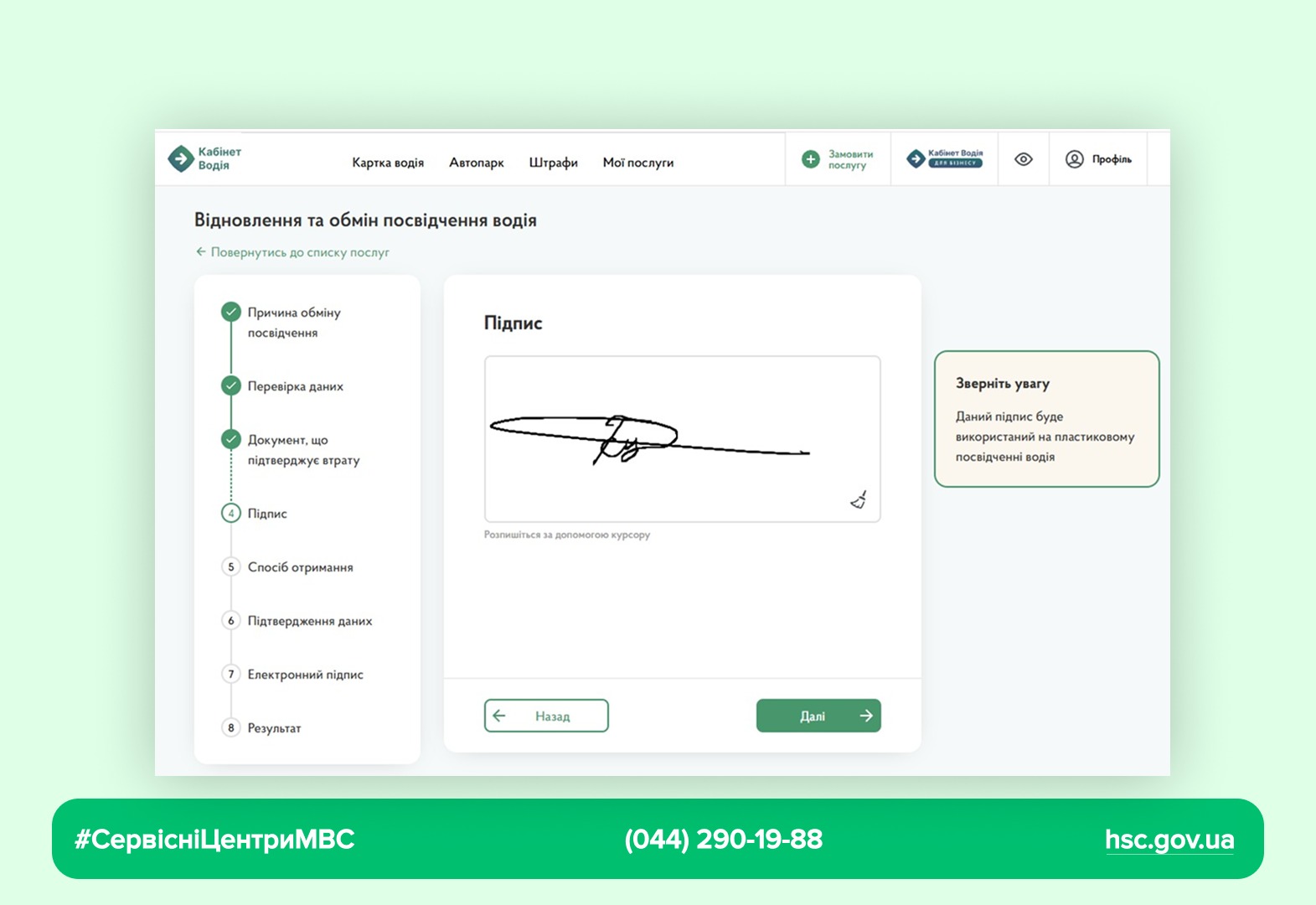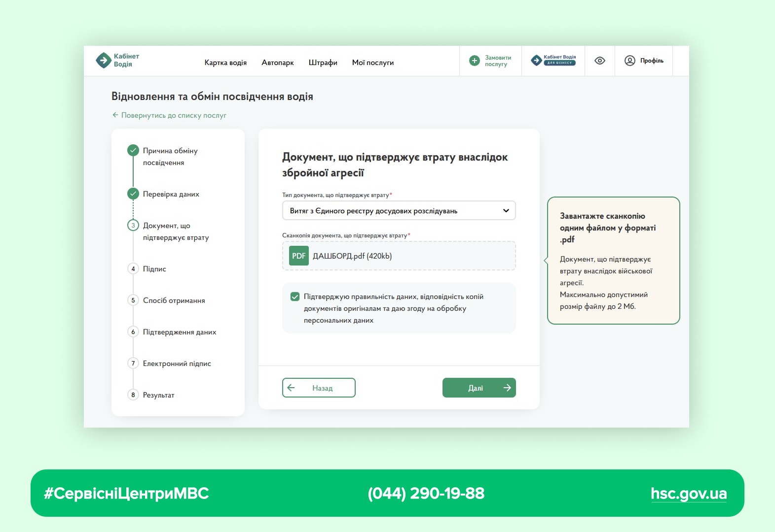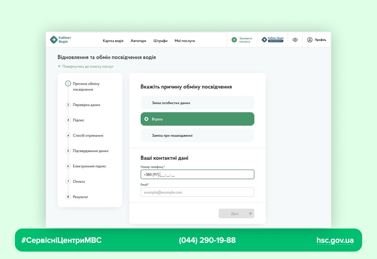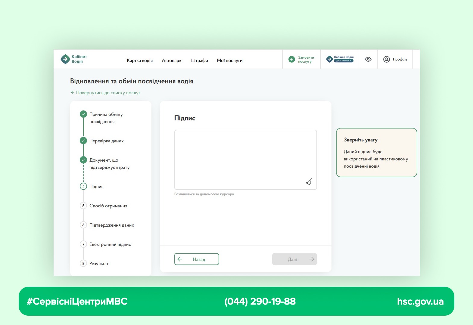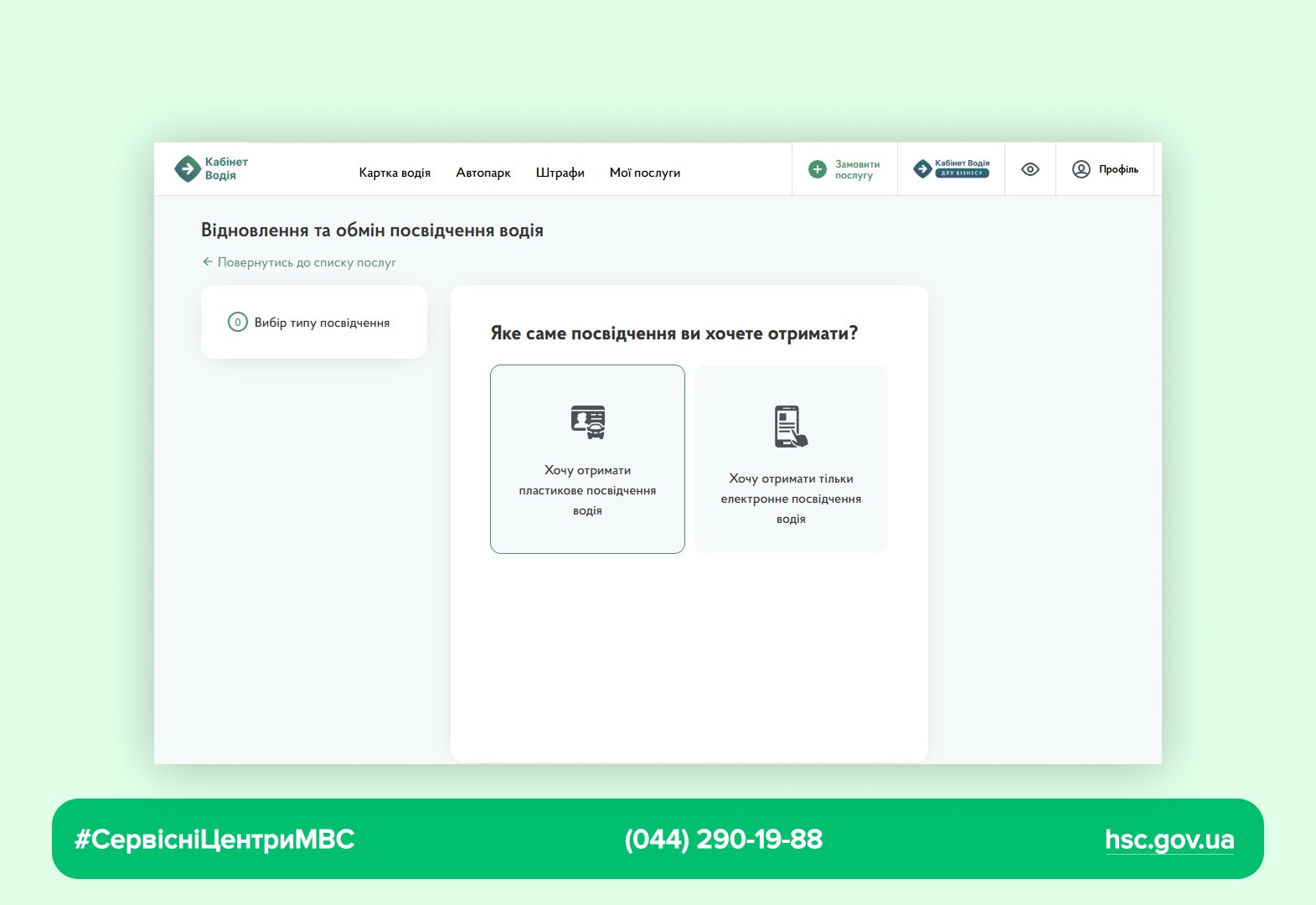 - вибрати тип нового посвідчення водія: пластикове або електронне;