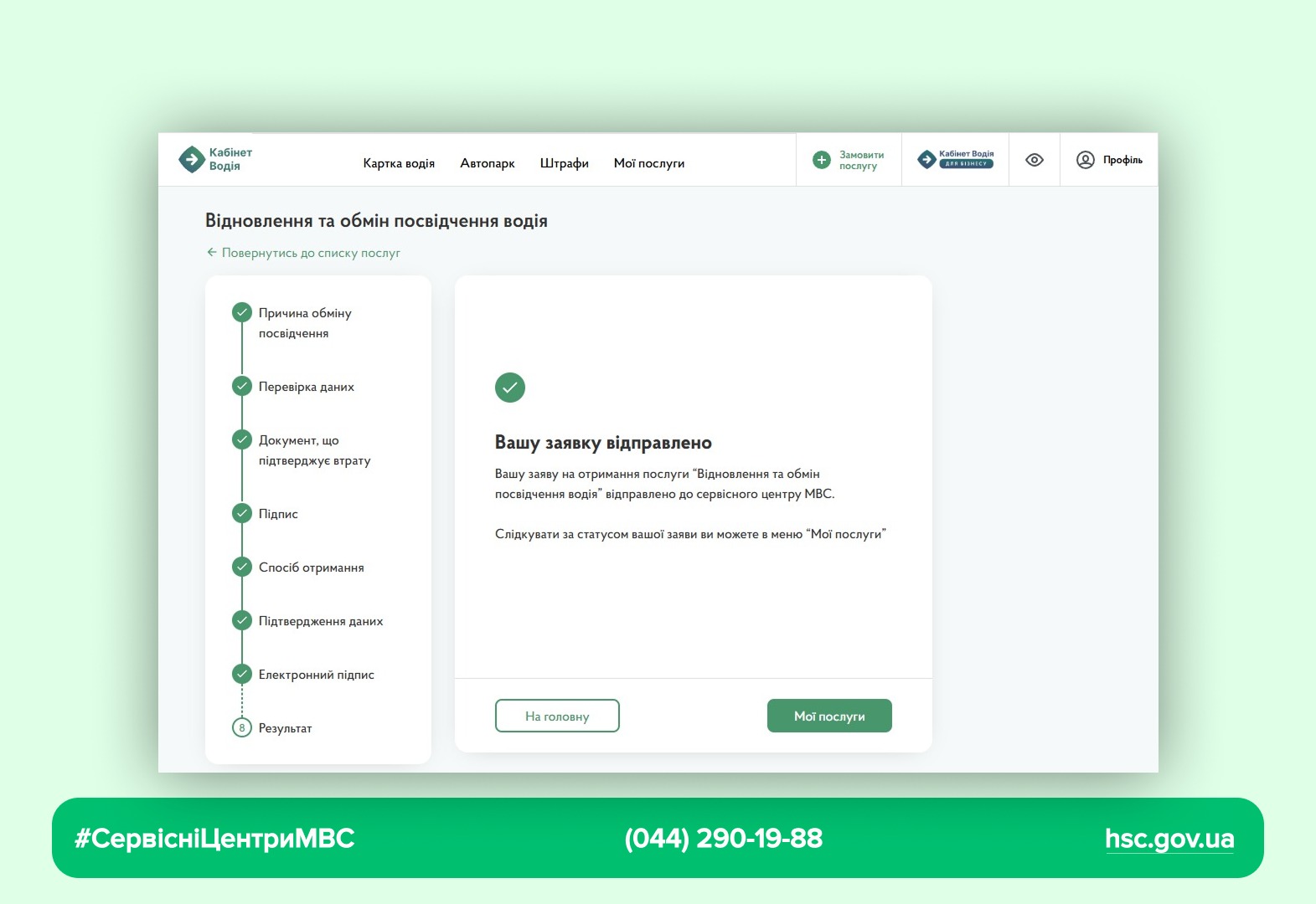 Для відновлення посвідчення водія онлайн, у Кабінеті водія повинно відображатись водійське з фото. Для отримання послуги необхідно авторизуватись у Кабінеті водія та вибрати послугу «Відновлення та обмін посвідчення водія». Далі виконати такі дії: