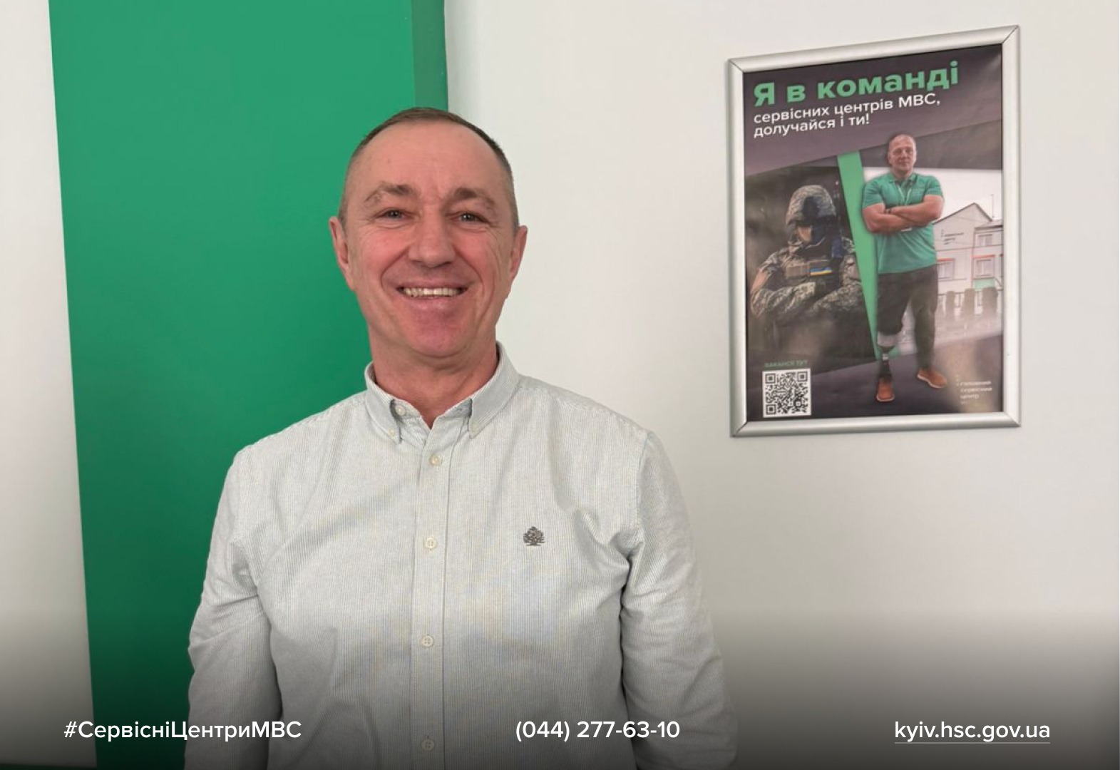 Його шлях у сервісному центрі МВС розпочався випадково. Валерій прийшов з донькою, щоб перереєструвати автомобіль. Побачив плакат із QR-кодом про вакансії для ветеранів, подав резюме, і з січня 2026 року працює головним спеціалістом із запобігання корупції у регіональному сервісному центрі МВС м. Київ.